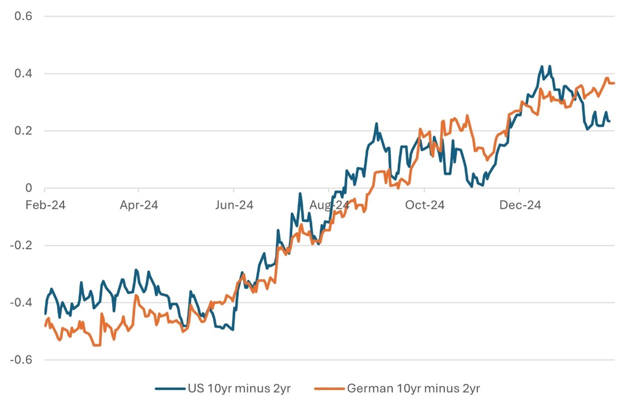 With talks of tariffs and higher risks of increases in government spending as countries up their defence budgets, the bond markets are very much on watch. The US and German yield curves have recently diverged in terms of shape as the risk to rates and long-term yields have had different influences. Germany/Europe face greater risks of inflation given the likely need to increase defence budgets and hence aggregate spending. Meanwhile the ECB seems committed to rate cuts, which has led to a steepening of the yield curve.