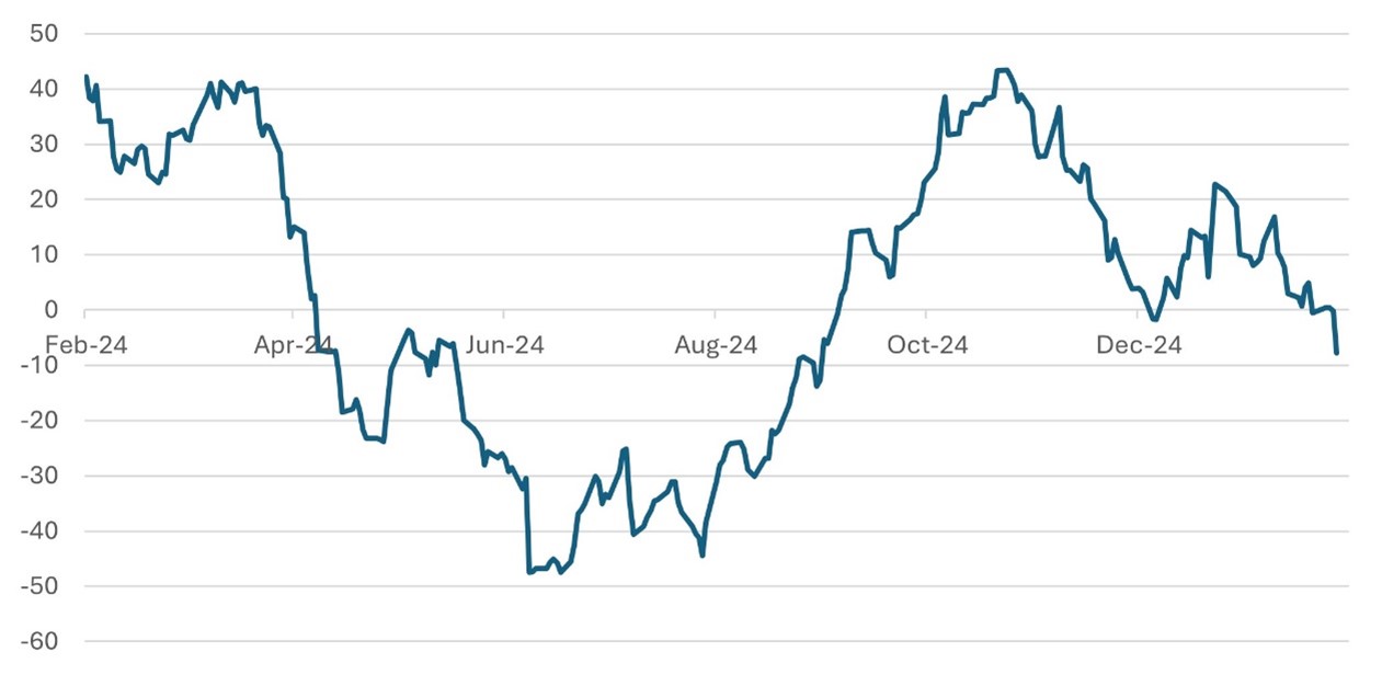 By contrast the US yield curve has gently flattened. There is some building hope that inflation is maybe on its way down. This week’s PCE deflator, the Fed’s preferred inflation measure, is expected to be around 3.6%, closer to the Fed’s target than other measures that have resolutely stayed around 3%. We think there is an increasing concern that US growth is weakening. The recent readings of the US economic surprise index have been noticeable, possibly reflecting the fallout from the impact of the trade tariffs and Elon Musk’s chainsaw approach to trimming government spending (and the federal workforce).