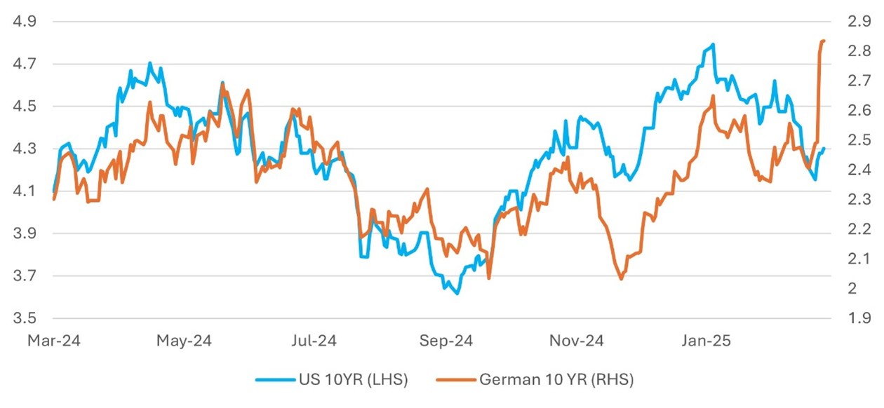 It’s Germany’s turn now to use the credit card. The likely German coalition that will run the next government announced a proposal that includes a €500 billion special fund dedicated to infrastructure projects and the removal of caps on defence spending, potentially leading to more than €1 trillion in additional borrowings over the next decade. While defence spending in 2024 has been around 2.1% of GDP, the coalition is proposing a further hike in defence budget to 3%. The 42bps increase in the German 10-year government bond yield reflects the markets’ sharp change in perception of the future.