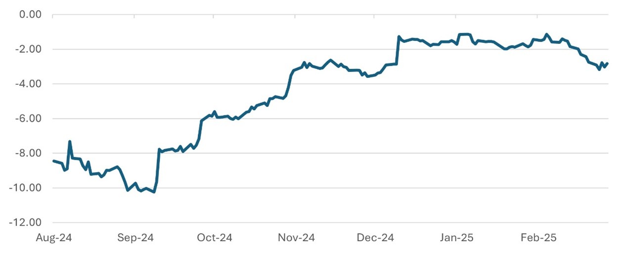 Investors are drawn between pricing a recession and a spike in inflation with the current US 10-year yield about right in the very near term. The drop in the US 10-year yield January onwards until very recently reflects the policy mayhem and the consequent drop in US economic activity. The market went from expecting a vibrant start to the year to seeing data that suggested a recession was at hand. In just the last week, we have seen the market increasingly getting concerned about the impact of tariffs on inflation. Hence, we have a bias to the shorter duration, which is more concentrated around the 2-year area of the curve. We suspect this week’s inflation has a bias to being above expectations given the strong showing of inflation in the industrial surveys.