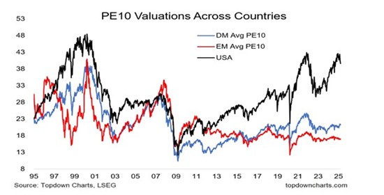 Chart 1: Shiller PE valuations highlight the extreme valuation premium of U.S. equities