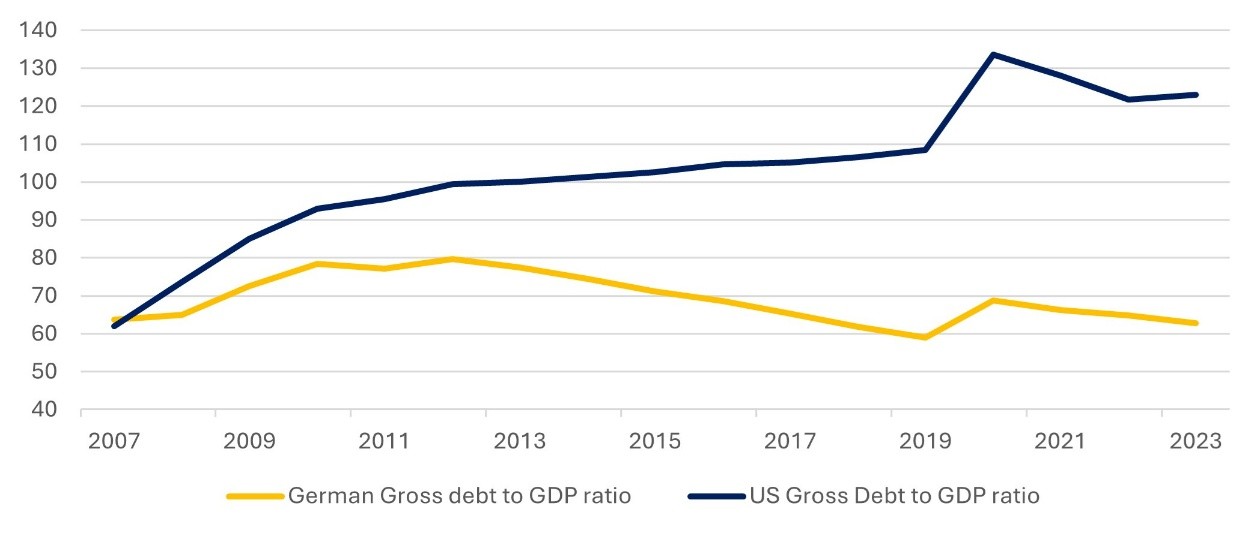 A key driver of this outperformance is the improving relative fundamentals of markets outside of the US. Take Europe, for instance, where Germany, among other nations in the continent, is significantly increasing its defence budget, signalling greater fiscal flexibility and a willingness to recalibrate but not exaggerate debt-to-GDP ratios.